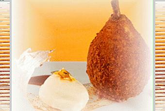 DRESSAGE : disposer sur l’assiette la poire rôtie et accompagnée la d’une boule de glace vanille voire une crème glacée aux amandes et d’un trait de sauce caramel.