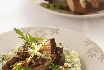 Écrasé de pommes de terre à la roquette et à l’ail, sauté de champignons aux noisettes (et pas aux glands)