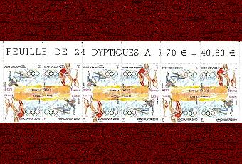 Mais la poste française est décidément fâchée avec la langue française !!!L'inscription dans la marge supérieure mentionne en effet que cette feuille est composée de 24 dyptiques à 1,70€, soit un total de 40,80€ par feuille.