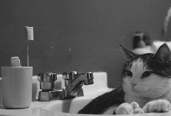 Mon chat, Néné, qui pour une raison inconnue adorait dormir dans l’évier ou le panier à linge sale, c’était selon. J’avais évalué, à l’époque, que l’évier était plus prometteur comme mise en scène pour une photo. J’ai donc patiemment attendu qu’il fasse comme à son habitude.