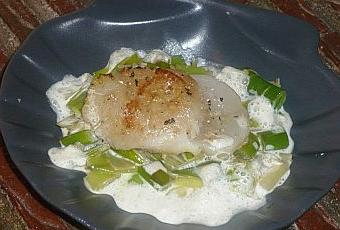 Déposez une st jacques au centre de chaque assiette sur un lit de poireaux puis émulsionnez la crème, avec un fouet ou un mixeur girafe, avant de la verser sur chaque