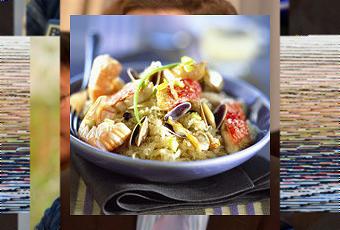 3 Chauffez la choucroute sur feu doux. Tranchez le chorizo, dorez-le à la poêle. Répartissez-le dans la choucroute avec les moules et les coques. Arrosez de jus et servez.