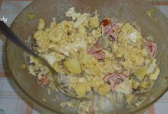 Faire cuire les pommes de terre avec la peau pendant 20 minutes à l'eau bouillante salée. Les laisser refroidir puis les éplucher et les couper en gros dés. Faire cuire les œufs 10 minutes à l'eau bouillante; les laisser refroidir. Laver les tomates, les épépiner et les détailler en petits cubes. Disposer les tomates dans un saladier, ajouter les cornichons découpés en rondelles et le jambon préalablement coupé en dés. Après avoir écaler les œufs durs, les couper grossièrement et les mélanger avec les pommes de terre dans un saladier. Ajouter délicatement la mayonnaise et placer au réfrigérateur 1 heure avant de consommer.