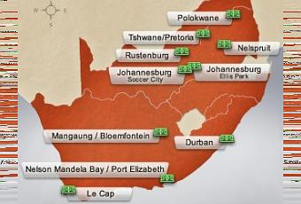 5 nouveaux stades on été construits pour le tournoi (3 lieux de matchs et de 2 nouveaux terrains d’entrainement), et 5 des sites existants doivent être améliorés. Les coûts de construction devraient être 8.4 millards ZAR.