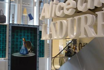 A l’occasion de la sortie d’Alice in Wonderland de Tim Burton, Printemps-Haussmann de Paris se transforme en une véritable vitrine grandeur nature où le salon de thé tiré du roman se retrouve exposé au plaisir de tous. La table du banquet remplie de pâtisseries et de montagnes de macarons Ladurée… Dans ce décor exubérant La Maison Ladurée propose des macarons inspirés de l’univers d’Alice au Pays des Merveilles développés en exclusivité pour ce Salon de thé éphemère au Printemps.