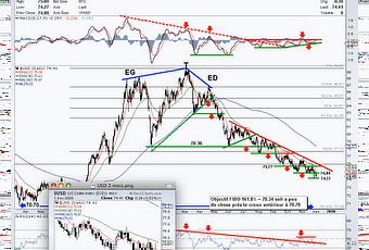31 mai 2009 « Sur cassure significative de la zone des 0.78¢, la prochaine cible est la Fibo 161.8% à 70.37, soit l’équivalent du creux antérieur à 70.70. »Autres textes concernant la devise américaine: