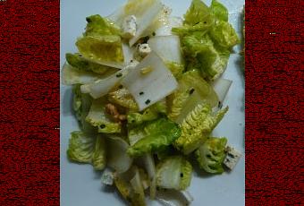 Mercredi soir, en accompagnement d'une sorte de tortilla parfumée, plaisir frais et croquant d'une salade typiquement de saison, un grand classique : salade d'endives aux noix et au Roquefort. Avec la légère amertume des endives adoucie par quelques coeurs de laitue, c'est encore mieux ! Un des grands plaisirs de cette salade est le mélange des goûts (légère amertume des endives et des noix, piquant du fromage) et des textures croquante, onctueuse, sèche, ...