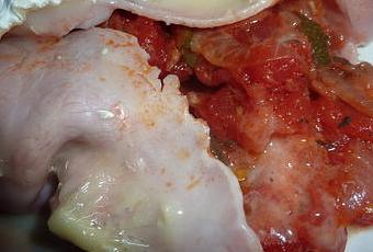 Quand la flemme s'installe voilà ce que ça donne !!! Du jambon blanc, des dés de tomates en boîte, le plus long a été d'éplucher et de couper l'oignon en lamelles ainsi que la courgette !!!