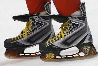Non ce ne sont pas ceux de Brian mais d'Aleksandr Ovetchkine, fameux (si si) joueur professionnel russe de hockey sur glace qui, א l'occasion des JO, a dיcorי les lames de ses patins d'une bien drפle de faחon : outre son numיro, le 8, il y a fait figurer le drapeau de la Russie mais aussi et surtout une tךte de mouton-dיmon (c'est l'espטce de truc sur l'arriטre, oui, lא)