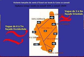 Après-midi de samedi: Les vents deviennent vraiment forts particulièrement sur le Nord de l'île (Cap-Corse - Région Bastiaise - Balagne), avec des rafales dépassant les 120km/h dans le Cap et en Balagne, et dépassant les 110km/h dans la région Bastiaise. Mais aussi le Sud de l'île (Solenzara - Bonifacio - Porto-Vecchio), où les rafales atteindront 100km/h voire même les 120km/h. Sur les façades Orientale et Occidentale, les vents se maintiennent à la même vitesse que le matin (90 / 100km/h).
