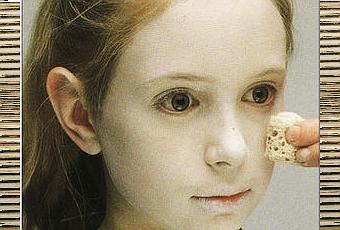 4 - Demandez a votre enfant de fermer les yeux, puis, en violet maquillez le bord des paupières et tracez une fine ligneoblique sous les paupières inférieures. Colorez le bout du nez dans la même teinte et reliez-le à la bouche par une fine ligne verticale. soulignez la forme naturelle des lèvres de votre enfant( toujours en violet) en veillant à ne pas recouvrir le tiers central de la lèvre inférieure.