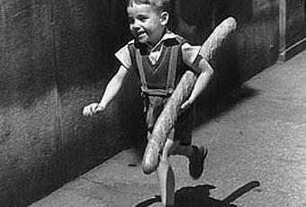 Le jour où je suis tombé sur ce document j'ai eu un choc, j'ai cru me voir sur cette photo. Ce petit garçon en culotte courte qui court sur le trottoir, il revient de la boulangerie sa baguette sous le bras et certainement la monnaie en centimes de francs au fond de sa poche. C'est le printemps, il fait beau mais il a néanmoins un pull sans manche car il fait peut-être encore un peu frais, du moins est-ce l'avis de sa maman qui l'a envoyé faire cet achat de dernière minute, juste avant de passer à table, du pain frais de la dernière fournée, avant que le père ne revienne du bureau pour déjeuner.