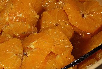 Quand il est prêt, versez un peu du jus des oranges pour stopper la cuisson (attention aux projections), puis versez le dans le saladier des oranges. Les morceaux vont fondre, pas de soucis :)