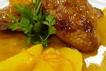 Canetons cuits «à l’étouffée» dans une cocotte hermétiquement fermée, servis avec une sauce aigre-douce réalisée à partir de fond brun de volaille, de jus d’orange et de zestes d’oranges et de citron macérés dans une liqueur à base d’orange.