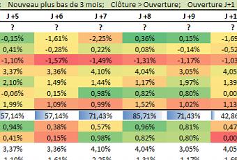 Vous pouvez constater qu’après 2 ou 3 jours hésitants, l’euro se renforce contre le dollar. Les meilleurs résultats étant concentrés entre J+4 et J+9.