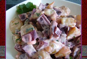 Lavez les pommes de terre et faites les cuire dans un autocuiseur une dizaine de minutes. Coupez les betteraves en petits dés, placez les dans un saladier. Pelez et coupez en cubes les pommes de terre, les rajouter avec les betteraves. Dans un bol, mélangez le yaourt, la moutarde, l’huile, l’oignon haché, l’ail, la coriandre, le sel et le poivre. Versez la sauce sur les pommes de terre et betterave, mélangez et servez.