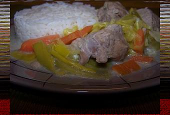 Découper la viande en morceaux. Mettre à fondre la margarine dans la cocotte minute. Y faire revenir les morceaux de viande de tous côtés. Saler et poivrer. Saupoudrer de farine. Mélanger. Couvrir d’eau bouillante. Remuer en grattant le fond. Fermer la casserole à pression. Cuire à feu moyen 25min (à partir du moment où la casserole commence à chuchoter).