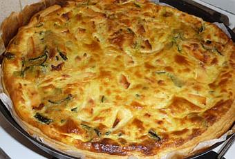Étaler votre pâte feuilletée dans un moule à tarte, la piquer et étaler les courgettes, la vache qui rit en petit morceaux et le mélange œufs / lait.