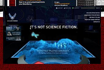 Je tombe par hasard sur le site de l'armée de l'air américaine : http://www.airforce.com/. Construit comme un jeu vidéo à la Unreal Tournament. Ça me laisse perplexe et songeur. Frisson dans le dos!!! J'imagine qu'ils ont voulu faire la chose attrayant pour les jeunes... Double frissons dans le dos!!!! Très très très perplexe.