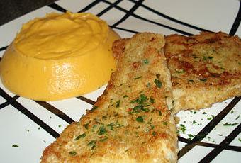 Voici un plat très facile à faire donc vous n'aurez plus d'excuse pour faire du poisson pané carré car coté goût c'est incomparable. Vous pouvez choisir le poisson blanc de votre choix, moi j'ai pris de l'églefin. Je l'ai servi avec une purée de patates douces, c'est une purée que je fais très régulièrement (beaucoup plus souvent que la purée de pommes de terre) et ce jour là j'ai décidé de remplacer l'huile d'olive que j'utilise habituellement par de l'huile d'olive aromatisée au gingembre et citron, c'était très bon et ça se mariait très bien avec la patate douce.