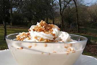 Battre au fouet électrique 15 cl de crème liquide très froide lorsqu'elle commence à prendre lui ajouter 15 g de sucre glace en pluie puis l'incorporer à la crème froide mise de coté