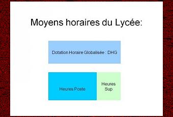 Etape N°1 : L’établissement reçoit sa Dotation Horaire : en Heures Poste( HP) et en HSA, en effet en moyenne un professeur certifié fait 18h00 de cours ( et autant en préparation et en correction ), et éventuellement des HSA : des heures supplémentaires ( légalement, il ne peut en refuser au moins une…)… Je simplifie ;: il y a des statuts différents ( agrégé, Eps ..) ,des personnes en temps partiel, et des heures payées autres que l’enseignement …