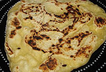 Faire chauffer 1 grande poêle (j'ai pris ma crêpière) légèrement huilée et faire cuire les naans 3 minutes de chaque côtés.