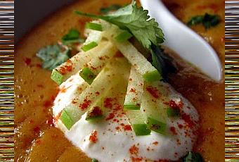 Verser le velouté dans des assiettes creuses, ajouter une grosse cuillère de fromage blanc et quelques bâtonnets de pomme. Parsemer de feuilles de coriandre ciselées et de quelques pincées de paprika. Servir de suite.