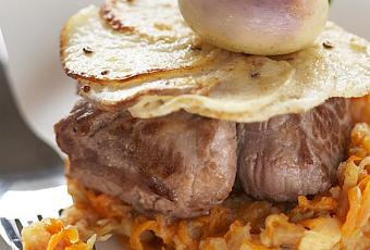 Agneau sauté, écrasé de potiron aux coings et 5 épices chinois, galette de navet à la cardamome verte.