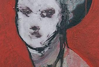 dernier état de flo sur fond rouge 50x50 acry et nombreux marouflages, j'ai du marouflé 10 de têtes différentes avant de trouver celle que vous voyez ici