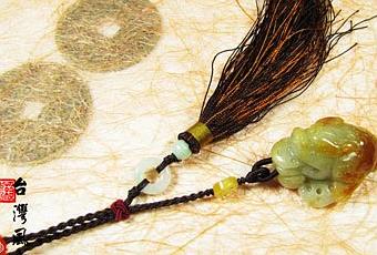Une jolie amulette avec une grenouille à trois pattes en jade. La grenouille est en jade dominante marron (or comme l'argent) avec une ancienne pièce de monnaie qui sort de sa bouche. Sa tête repose sur un lingot Chinois et elle tient aussi une autre pièce sous une patte. La grenouille est montée sur le cordon café avec une magnifique frange café et cuivre, je suis dans ma periode frange café et cuivre !!