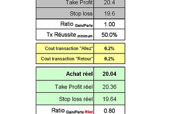 Exemple 1 :Cours d'entrée : 20 TP : 20.4 (+2%) SL:19.6 (-2%)Coûts de transactions : 0.2% Allez, 0.2% Retour