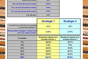 La stratégie 1 est utilisée par un investisseur qui aime le risque (il accepte de voir diminuer son capital de 50% au maximum au cours des 200 trades).La stratégie 2 est utilisée par un investisseur qui aime un peu moins le risque (il accepte de voir dimuninuer son capital de 35% au maximum au cours des 200 trades)