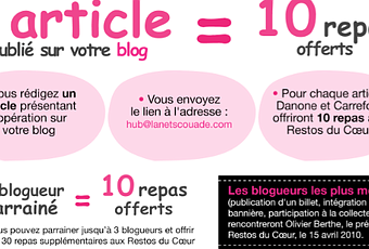 Bonjour aujourd'hui je vous parle d'une opération découverte chez CECILE DU BLOG mes gateaux rigolos au profit des restos du coeur. Que faire : - Insérer une bannière dans un article sur notre blog (voir la bannière après). - de publier l'article, cela va de soi. - d'envoyer le lien de l'article à l'adresse indiquée sur la bannière. En à peine quelques minutes, vous avez ainsi permis aux resto du coeur de recevoir 10 repas alors imagniez un peu, si chaque bloggeurprenait le temps de le faire, le nombre de repas que les resto obtiendraient !!!