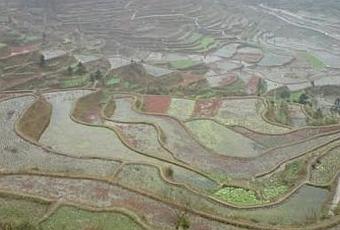 De près, je suis impressionné par le travail qu’il a fallu pour élever un seul niveau de rizières ; je lève les yeux et la démesure de l’ensemble me sidère. Une fourmilière de rides couvre la montagne aussi loin que porte le regard. Vertes, violettes ou sombres, les aires en lesquelles sont cloisonnées les rizières dessinent sur le moule des collines des motifs pareils à ceux, entre nuages et dragons, qui couvrent les bronzes anciens.