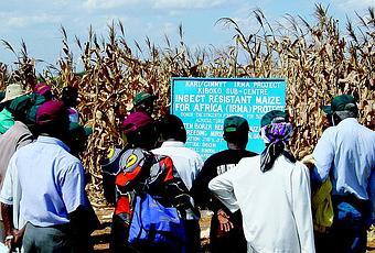 Image : Plantation de Maïs BT au Kenya. Ce maïs, résistant aux insectes, permet de limiter l'utilisation d'insecticides. Image sous licence Creative Commons Attribution 2.5 Generic, del PLoS.