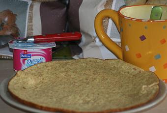 petit-dej : une galette aux sons, un café au lait écrémé sans sucre, et un fromage blanc nature 0%