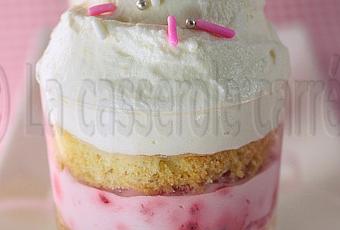 Poser la moitié supérieur de chaque cupcakes sur la mousse à la framboise et garnir chaque coupe de mousse au lemon curd (à la cuillère ou à la poche à douille, au goût).
