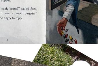 Poupi a donc choisi l’histoire de Jack and the Beanstalk dont je ne vois pas d’équivalent français, bien qu’il s’agisse d’un conte traditionnel pour les petits Anglais. S’habiller en Jack n’est pas forcément chose facile, d’autant moins que le personnage, pauvre au début et très riche à la fin, change de vêtements en cours d’histoire. Inutile de songer à acheter un déguisement tout fait; ça n’a pas l’air d’exister. Nous nous sommes donc arrangés pour improviser un approximatif costume de Jack; la tâche étant rendue ardue par le fait que Poupi n’aime pas se déguiser. Le plus sympa dans l’affaire était de fabriquer les haricots magiques multicolores, simplement avec des haricots blancs et de la gouache et de répéter l’histoire un certain nombre de fois. Et voilà: