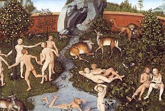 Les hommes sont innocents, heureux, vivent en union avec la nature et les dieux. Ils ont des fruits et des fleurs à volonté, sont eux-même généreux et sans soucis, ils ne vieillissent pas plus qu'ils ne connaissent la mort. C'est le Paradis, à ce détail près qu'ils ont une liberté sexuelle et d'amour libre, qu'on ne retrouve évidemment pas dans le paradis chrétien. L'Âge d'or est la race qui a été le plus apprécié des artistes : la liberté et le bonheur humain sont en effet plus aptes à être représentés que des hommes d'âge bête et méchant. Dans les deux peintures on retrouve le thème de la farandole, de la danse des hommes. Dans chaque tableau se trouve une grotte, duquel coule une rivière vivifiante. La grotte et l'eau symbolisent la féminité : c'est en effet assez visible dans la représentation de Cranach, où la grotte n'est pas sans faire penser au sexe féminin.. On remarque que la peau des femmes est plus blanche que celle des hommes. Cette distinction nous permet de voir qu'un homme a toujours une femme à ses côtés et vice-versa, notamment chez Cranach. Toujours dans cette peinture, il est assez amusant de constater que dans sa représentation des hommes libres dans la nature, insouciants etc, les femmes sont dévêtues, évidemment, mais ont cependant des coiffures extrêmement sophistiquées et très belles, et sont parées de multiples bijoux, comme toujours chez ce peintre, d'ailleurs. La sensualité est omniprésente dans chacune des peintures. Dans la première , les hommes et les animaux se trouvent dans un jardin clos et domestiqué, délimité par un mur rogue vif contrastant avec les couleurs froides de la nature, dans les tons bleus et violets. Alors que chez Zucchi, l'homme est en totale communion avec la nature, mais sauvage cette fois-ci. Mais la première différence entre ces deux œuvres, est que l'une est influencée par l'art médiéval, et l'autre par l'antique, comme on le contraste très nettement par la représentation du corps. Pourtant, elles n'ont qu'une vingtaine d'année d'écart, et c'est ce qui rend cette différenciation intéressante. Je préfère personnellement la sensualité antique.