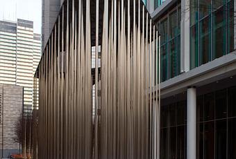 Le jour est d’argent, et la nuit est d’or à Regent’s Place, cinq hectares de terrains en plein développement de l’ouest de Londres. L’entrée de ce quartier en construction est marqué par un pavillon attribué après concours à l’agence Carmody Groarke. Eloge de l’inutile, leur intervention consiste en un volume matérialisé par une série de fins poteaux évoquant une forêt. Sous la lumière du jour, le pavillon à une couleur argentée. De nuit, sous l’effet d’un éclairage semblable au sodium, il prend une teinte dorée.