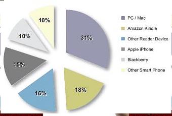 Et puisque l'on parle de lecture numérique quel serait l'appareil sur lequel les ebooks seraient lus ? Le graphique est plutôt parlant : les lecteurs ebook représentent une belle part, mais le Kindle reste toujours le plus cité. De même, si l'on demande quels sont les appareils les plus prisés pour la lecture, PC/Mac ressortent avec 28 %, contre 16 % pour l'iPhone et 12 % au Kindle. 22 % ne lisent simplement pas d'ebooks.