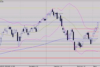 Le marubozu blanc formé ce jour, après avoir franchi toutes les résistances court terme, vient clôturer juste sous la résistance des 3914 points mais invalide surtout la résistance issue de la fenêtre baissière ouverte à 3862 points.