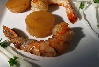 J'ai servi avec ce plat un Savennières Le bel ouvrage 2004 du domaine Laureau. La robe est d'un joli doré. Le nez est au départ sur le miel et l'abricot sec. Puis en s'aérant, la minéralité s'affirme, dévoilant des notes d'ardoises humides séchant au soleil, puis de résine. La bouche est ample, riche, bien mûre, tout en gardant une belle acidité qui allonge et équilibre le vin (c'est la magie du chenin, même bien mûr, il garde de la fraîcheur). La finale est sur le miel et l'encaustique. Le mariage est tout aussi intéressant avec le daïkon qu'avec la gamba.