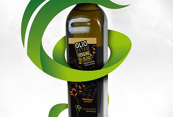 - La bouteille d’huile d’olive enrobée du logo qui reprend les initiales de Casulli Gastronomia de façon végétale