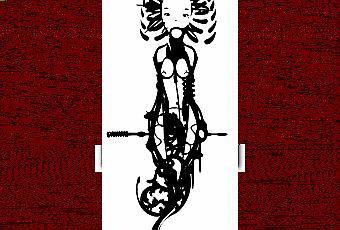N'est-il pas attachant ? Toujours est-il que son oeuvre me parut plus impressionnante que les autres parce qu'elle n'est pas dans le spectaculaire mais dans la subjectivité. L'artiste, qui se prénomme Robinson, a une vision certes gothique, toute vêtue (dévêtue parfois) de noir et de blanc, où les corps sont parfois difficiles à distinguer, enchaînés, enchaînant, enchevêtrés.. mais je ne peux m'empêcher d'être touchée par ces personnages qui, à priori, ont l'air de côtoyer un peu le côté obscur du plaisir et la face la plus ambigüe de la délicatesse (à ne pas raccourcir en fesse comme semblent vouloir l'indiquer les couleurs qui se sont rajoutées "à l'insu de mon plein gré" comme dirait le pédaleur)(2)... en témoignent donc les chaînes, les cravaches,