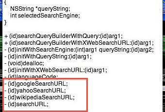 En épluchant le code de l'application Safari Mobile du SDK 3.2 beta 3, nous avons trouvé quelques fonctions plutôt intéressantes, nous aurons désormais le choix du moteur de recherche, en effet comme le montre le screenshot ci dessous, Yahoo est de la partie, Wikipedia aussi, il y aura peut être la possibilité d'ajouter des plugins.