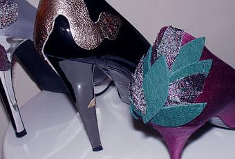 Le premier modèle est une fleur en tissu broché argent/rouge ou noire/rouge. Elle se colle à l'arrière de la chaussure et descend le long du talon :