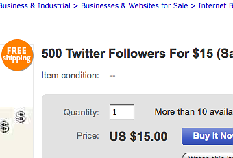 Mais il y a aussi des sites comme Tweecha… ou encore eBay ! Sur le site de vente aux enchères (sur ebay.com, sur ebay.fr, je n’ai rien trouvé), on vous propose quelques milliers de followers pour quelques dollars.