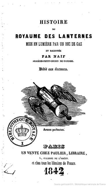 L'image en atteste, il ne s'agit pas d'un de mes nouveaux pastiches (nous ne sommes pas encore au 1er avril, patience ! juste à la veille des élections de mars), mais bien d'un concurrent de 1842 dont la plume s'est amusée à publier cette savoureuse "Histoire du royaume des lanternes, mise en lumière par un bec de gaz et racontée par Naïf arrière-petit-cousin de Candide". Sans doute s'agissait-il de Georges-Marie Mathieu-Dairnvaell. Peu importe au demeurant...